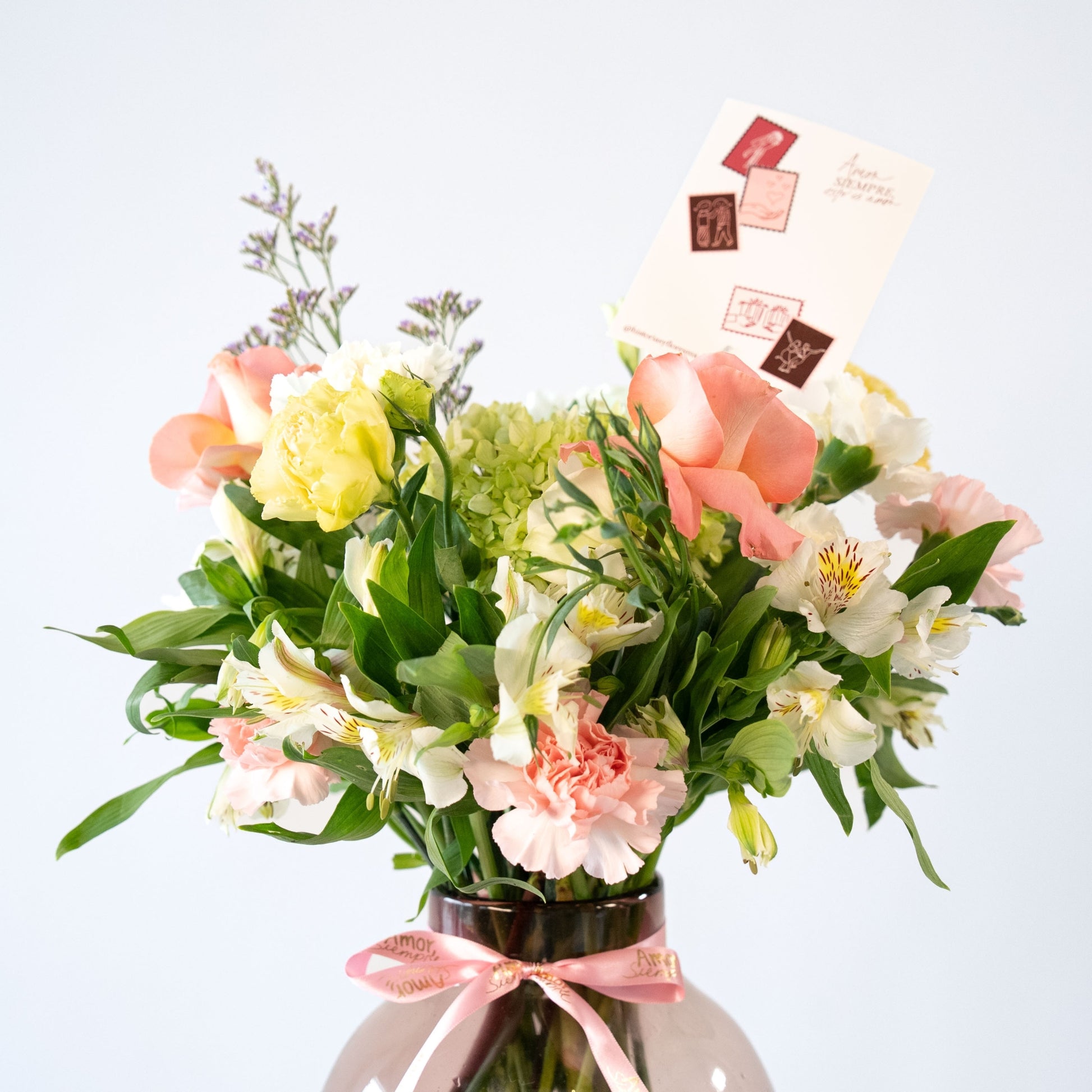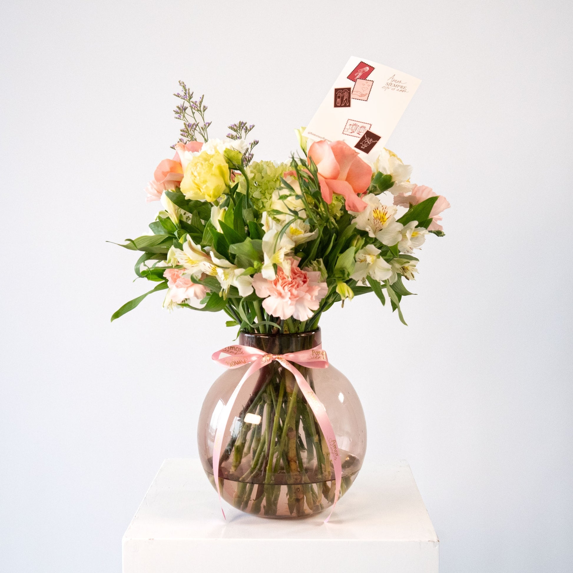 Jarrón de Vidrio soplado con variedad de flores, rosas, lisianthus, claveles & combinación de follajes premium.