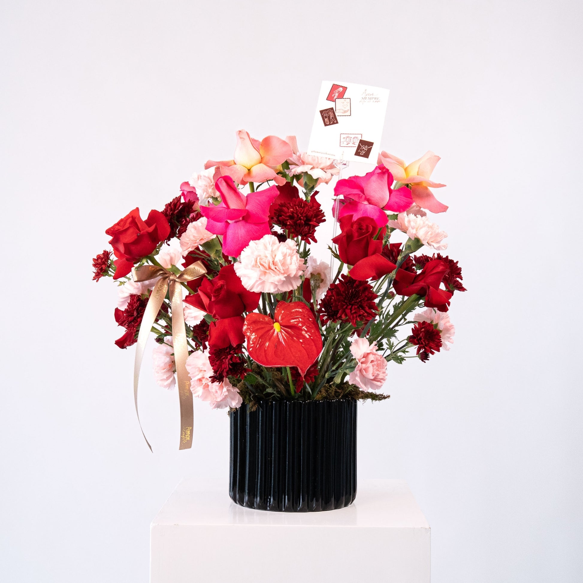 Base de cerámica negra con combinación de Anturio, rosas, claveles, margaritas + follajes premium.